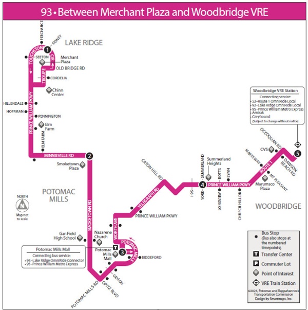 | Merchant Plaza | Smoketown Plaza | Potomac Mills Mall | The Crossings at Summerland | Hub: Woodbridge VRE | Summerland Heights | Potomac Mills Mall | Smoketown Plaza | Merchant Plaza |